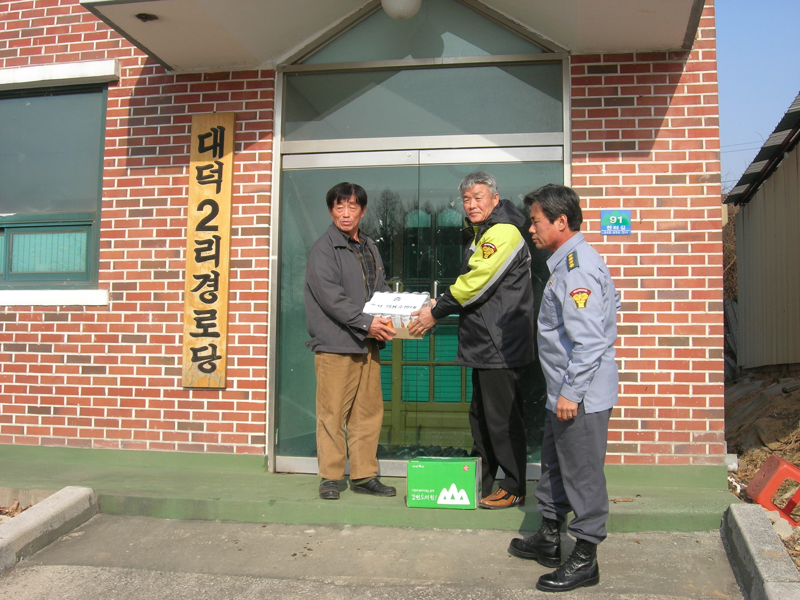 원주소방서(서장 조근희) 태장119안전센터 호저의용소방대장 외 4명은 호저면 대덕2리 노인정에 방문하여 동절기 난방비 십만원, 음료주 1박스, 소주 1박스 등을 지원하였습니다. 더불어 살아가는 세상... 어려운 이웃들과 함께 하시길 바랍니다.