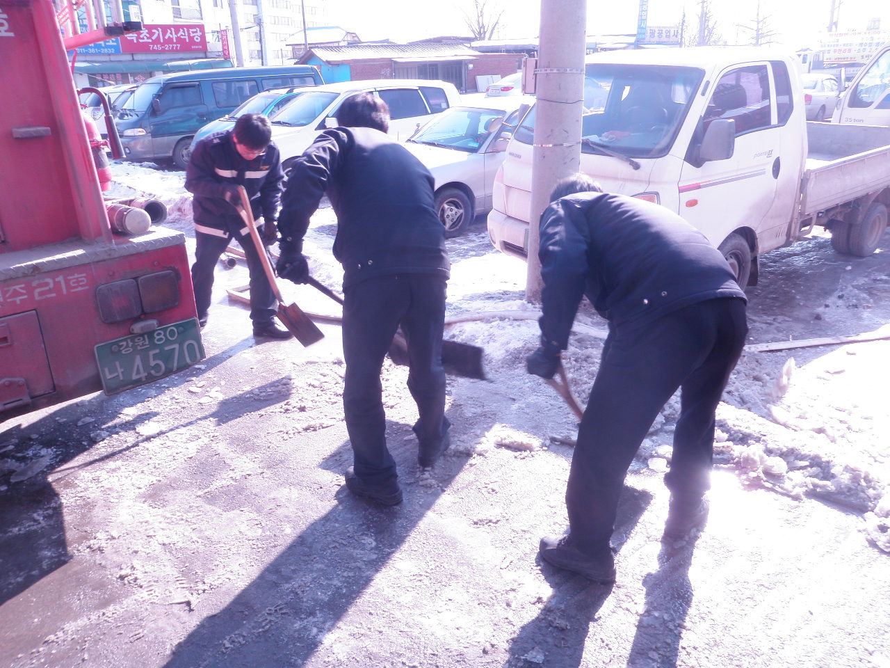 원주소방서(서장 박창진) 문막119안전센터에서는 금일 청사주변 및 차고 앞 출동로 제빙작업을 실시했습니다. 잦은 급수지원으로 차고주변은 흘러내린 물로 자주 얼어붙지만 출동시 안전사고를 방지하기 위하여 살을 에는 날씨에도 직원들은 매시간 물기 및 얼음제거작업을 실시하고 있습니다. 사고는 사전에 방지하는게 좋겠죠? ^^