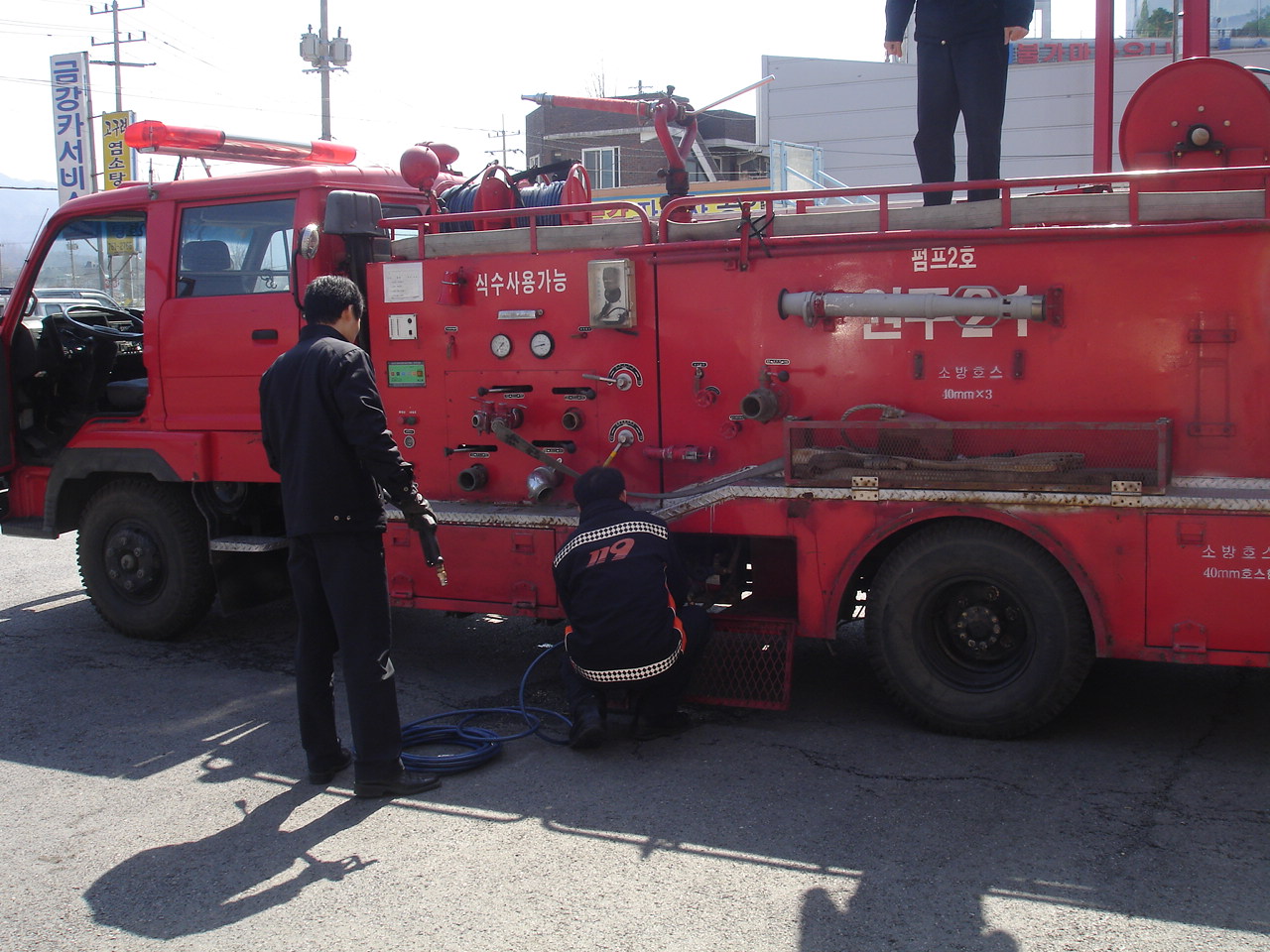 차량 적재호수 외 예비호수도 확인하고 산불진화장비도 사용하여 이상유무를 확인하였습니다.