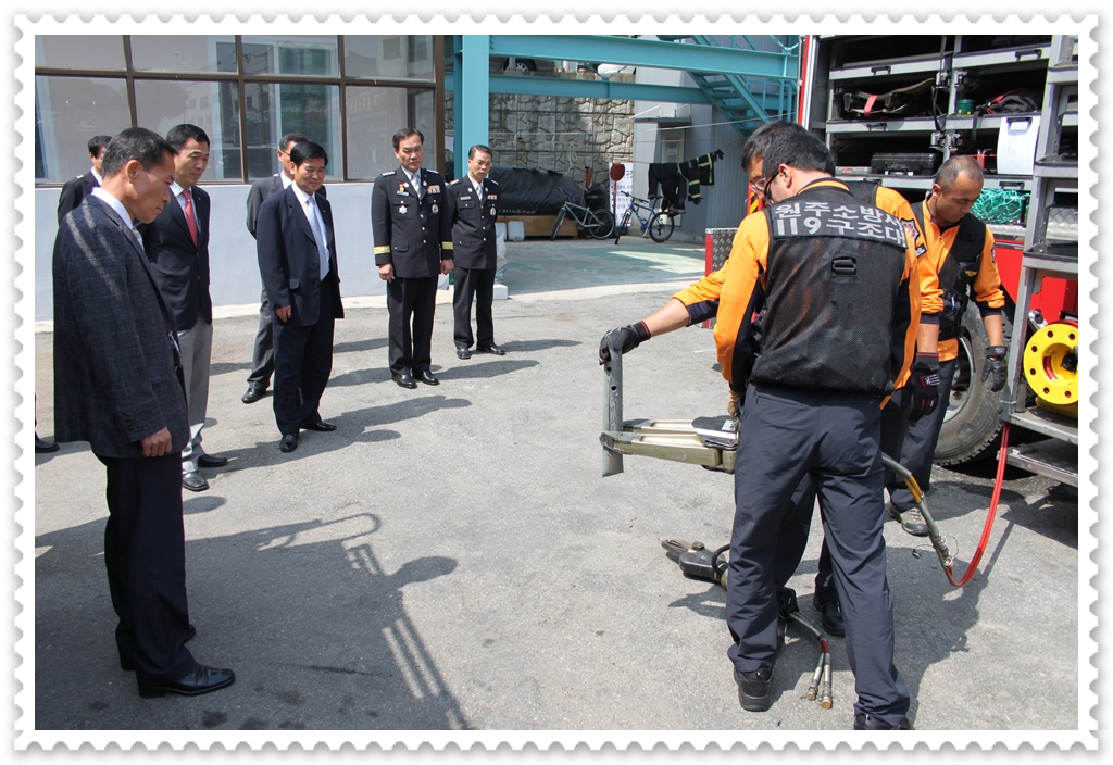 협약식 행사를 마친후에는 본서 후정에서 구조장비 시범 등 소방장비를 둘러보았다.