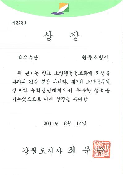 원주소방서가 최우수상을 수상하였습니다
