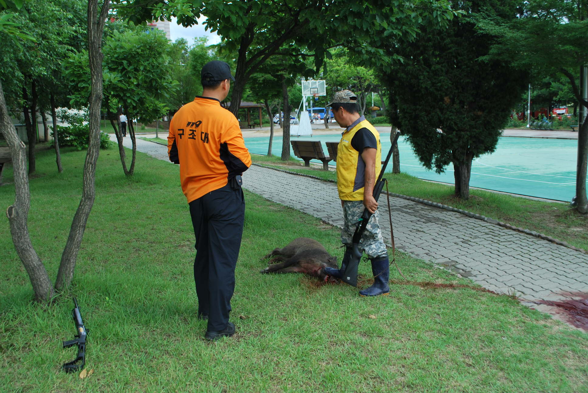 신속하게 출동하여 포위망을 만들었으며, 경찰, 시청관계자 분들과 합동으로 작업중 엽사의 총에 사살되어 상황은 종료되었습니다.