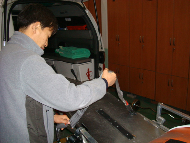 원주소방서(서장 김시균) 태장119안전센터에서는 금일 구급차 5단주들것 벨트가 덜렁거리더니 결국 파손되어서 새것으로 교체했습니다. 좁은엘레베이터에서의 사용,환자의 상태에 따른 자세고정 시 신속한 이송을 요할 시 적절하게 조절하여 사용이 가능한 구급대원의 애물단지 장비로 올해도 태장구급대는 최선의 구급서비스를 위해 만전을 기하겠습니다.