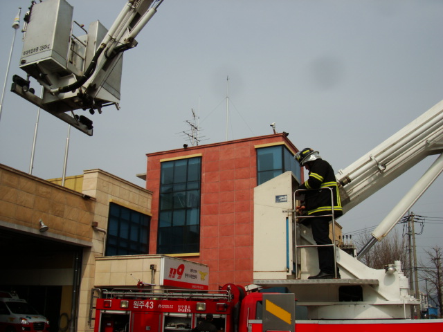 고층 사고에 대비하여 굴절사다리 작업 가능 거리 등 확인 및 신속한 전개를 위하여 센터 옥상에 가상으로 화점을 설정하고 신속하고 안전한 작업을 위한 전개 훈련을 실시하였습니다.