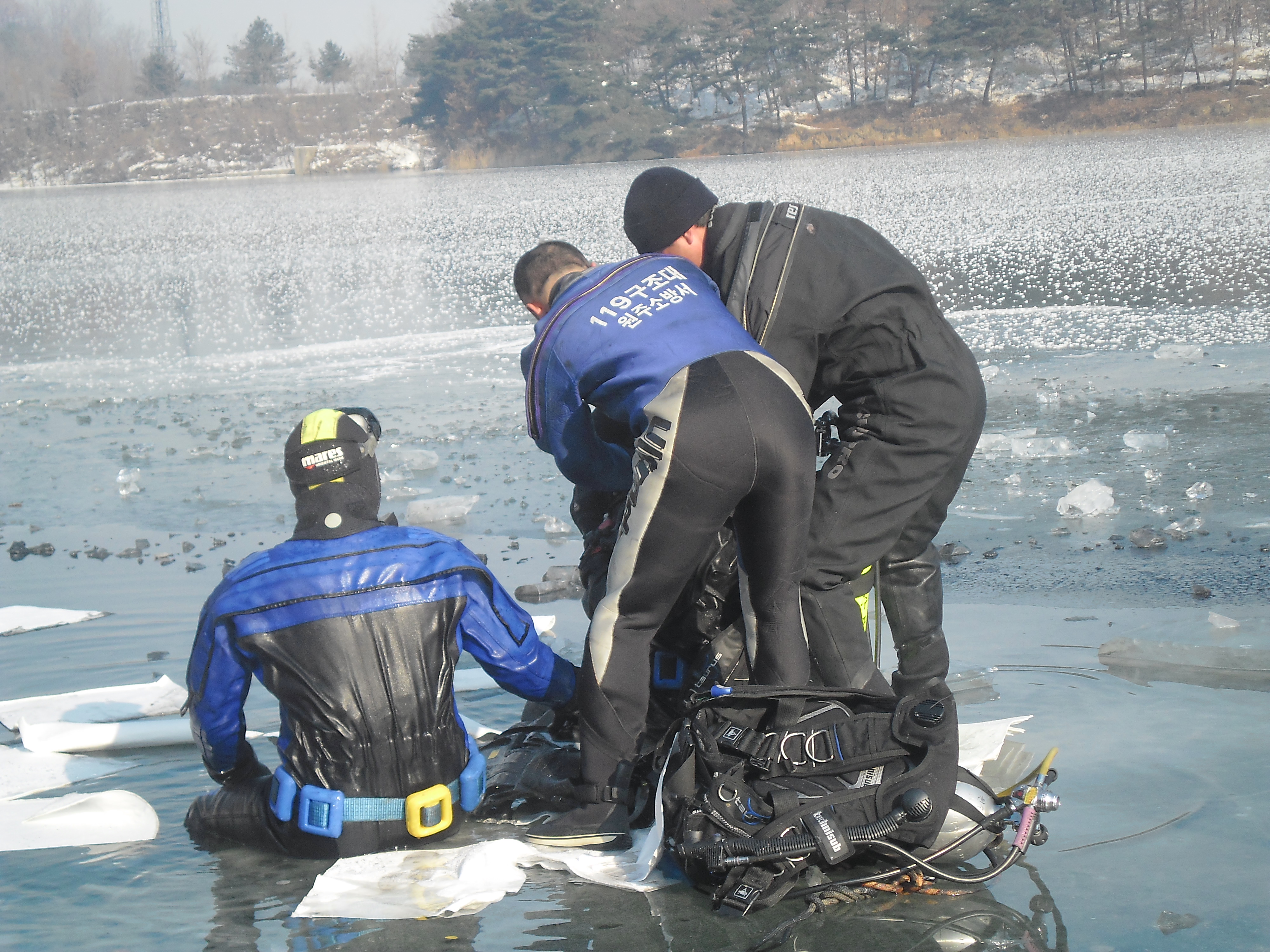 원주소방서(서장 김시균)현장대응과 119구조대는 12일 오전 원주시 문막읍 건등저수지에서 렉스턴차량이 10m저수지 아래로 추락한 승용차 운전자를 아이스다이빙하여 발견 및 차량을 렉카차량 견인고리에 연결하여 인양하였습니다.