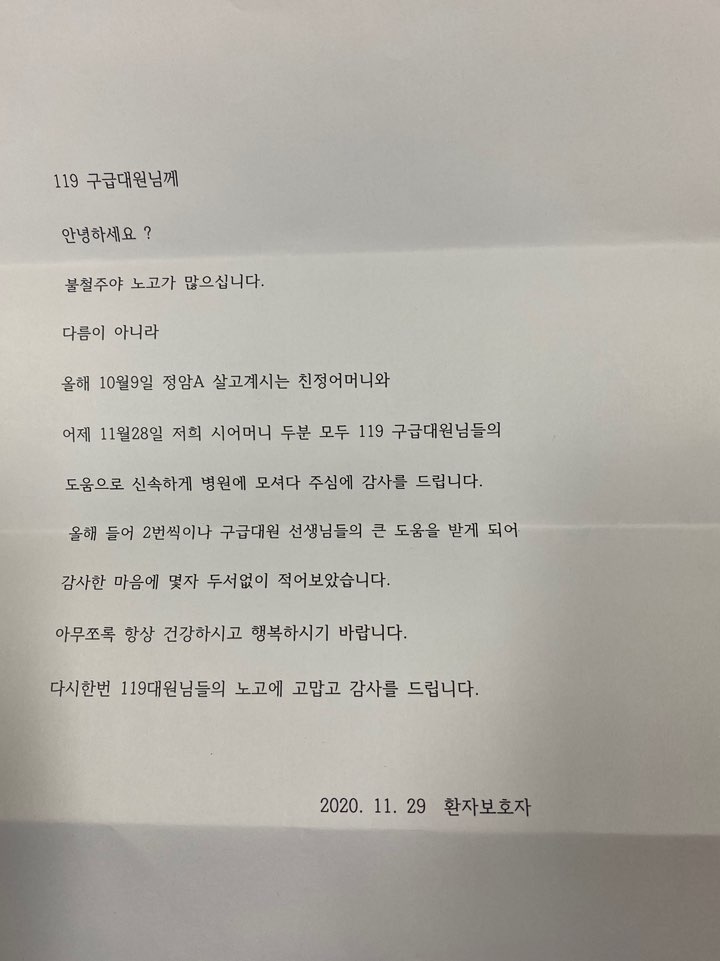 11월 28일 구급 이송 건에 대한 감사의 편지 및 다과를 전달해 주셨습니다.