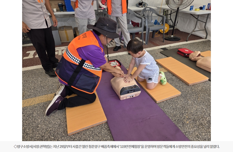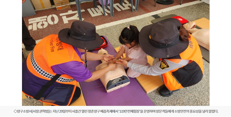 【양구】양구소방서는 지난 29일부터 사흘간 열린 청춘양구 배꼽축제에서 '119안전체험장'을 운영하며 방문객들에게 소방안전의 중요성을 널리 알렸다.