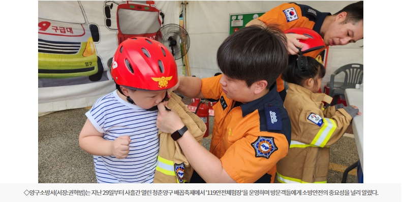 권혁범 양구소방서장은 "축제 현장을 찾은 군민과 관광객이 안전의 중요성을 몸소 체험하며 위기 대응 능력을 키울 수 있기를 바란다"며 "앞으로도 다양한 체험 프로그램을 통해 안전문화 확산에 앞장서겠다"고 말했다.