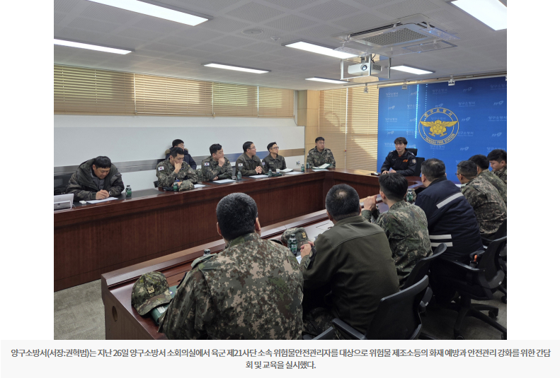 양구소방서(서장:권혁범)는 지난 26일 양구소방서 소회의실에서 육군 제21사단 소속 위험물안전관리자를 대상으로 위험물 제조소등의 화재 예방과 안전관리 강화를 위한 간담회 및 교육을 실시했다.