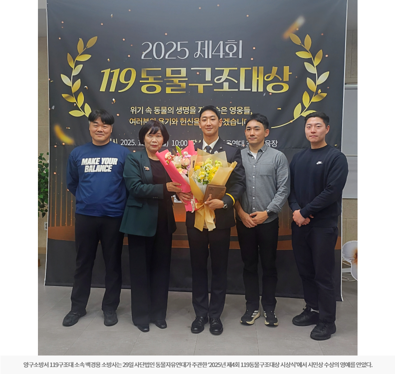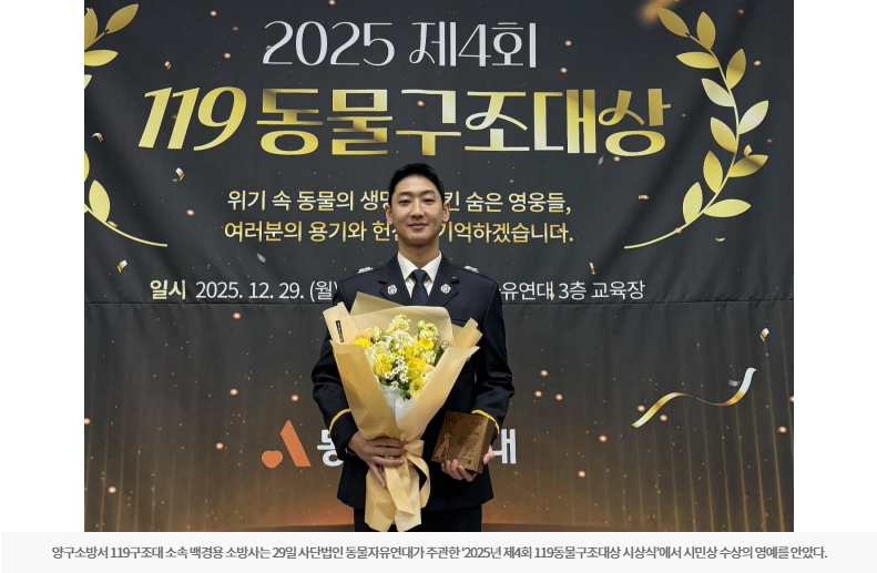 백경용 소방사는 29일 사단법인 동물자유연대가 주관한 ‘2025년 제4회 119동물구조대상 시상식’에서 시민상 수상의 영예를 안았다.