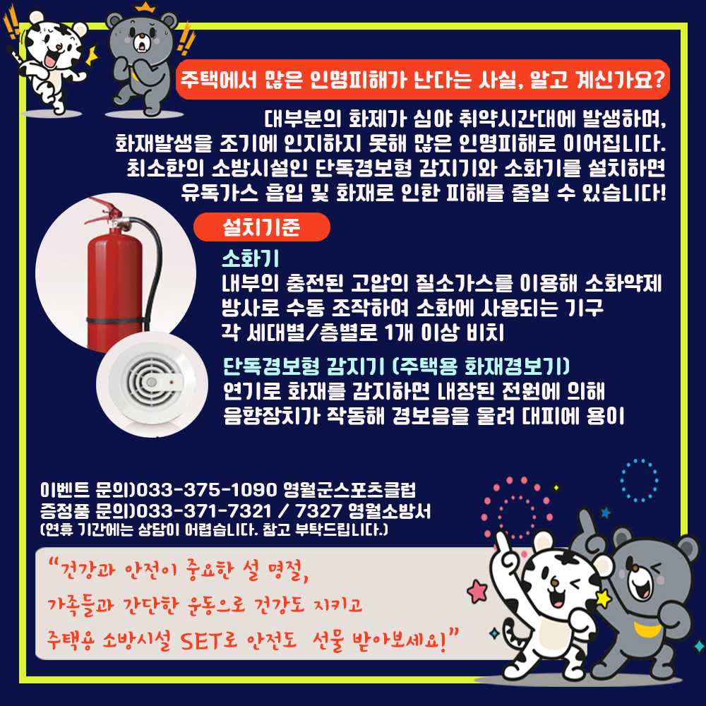 설 명절을 맞이하여 영월소방서는 영월군스포츠클럽과 함께 "안전하고 건강한 삶을 위해" 주택용 소방시설 보급 이벤트를 개최합니다.