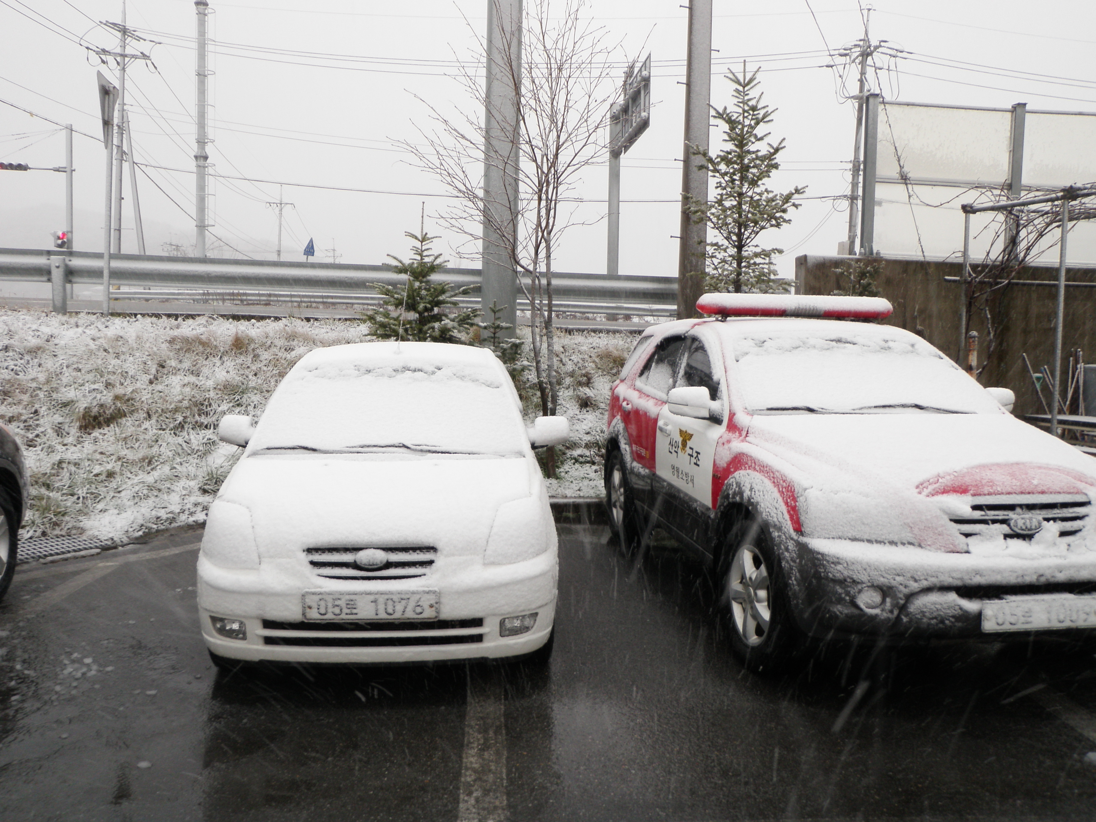 행정차와 산악구조차위에 눈이 이뿌네요~
