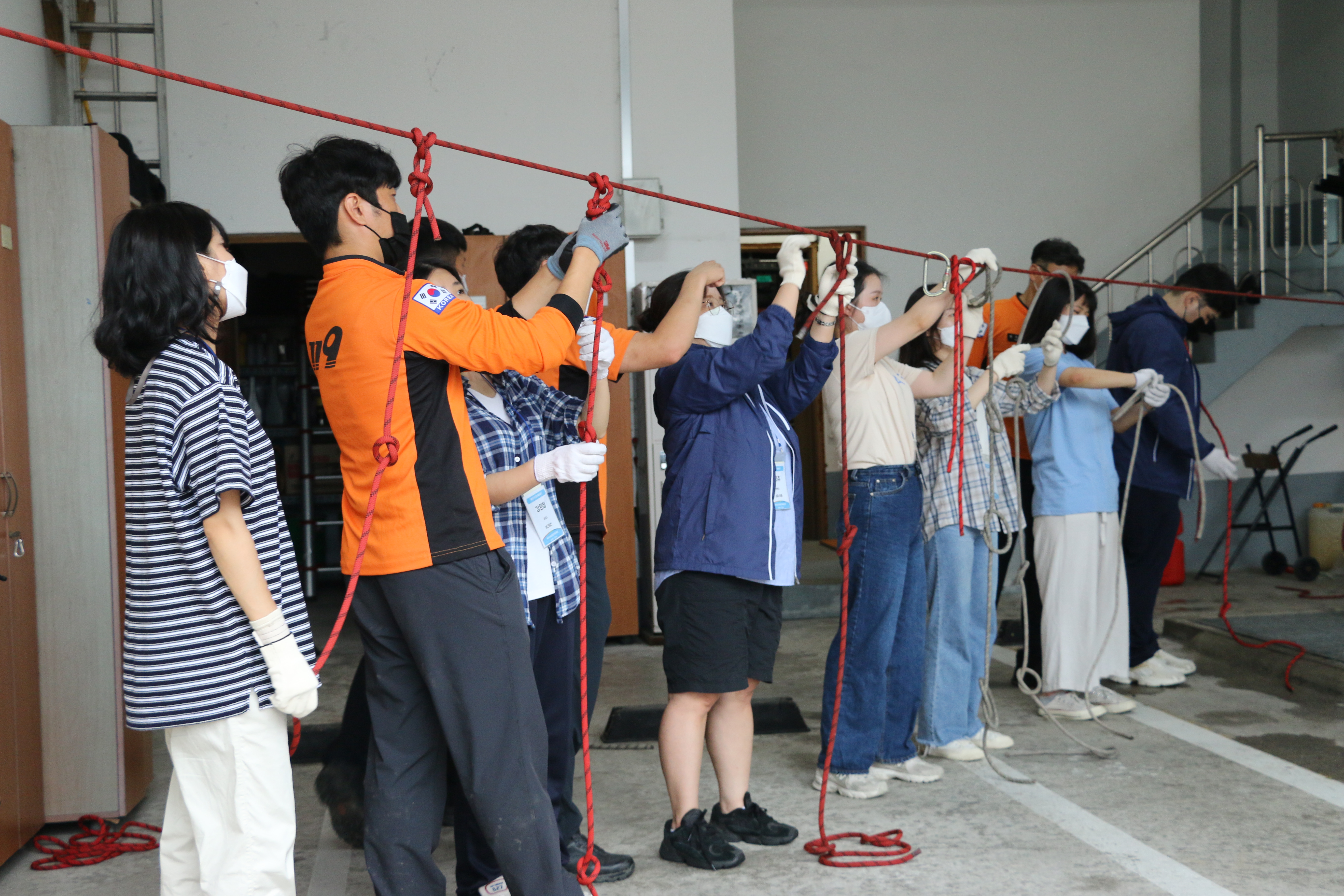 ○ 이날 교육은 진달래 “교육담당자”의 화재 시 대피요령, 다양한 매체를 통한 119 신고방법, 완강기 사용법 등 이론 교육을 시작으로 ▲소화기ㆍ소화전 사용법 교육 ▲방화복 착용 및 농연장 체험 ▲로프매듭활용 훈련 및 화재 시 비상탈출 방법 교육 등 다양한 체험 교육을 진행됐다.